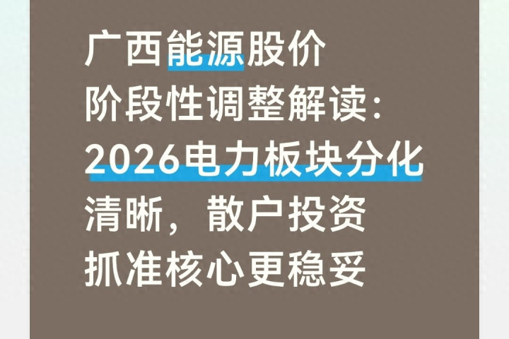 2026年3月下旬到4月初,广西能源股价出现阶段性调整,很多普通投资者既疑惑又迷茫,不知道这是短期市场行为,还是行业逻辑发生了变化,更不清楚后续电力板块该如何理性布局。今天我就用最接地气的大白话,把这次调整的原因、电力行业的最新变化、以及适合普通人的投资思路,完完整整讲清楚。全程不搞晦涩专业术语、不渲染负面情绪、不做夸张预判,所有内容基于2026年4月最新公开数据和行业政策,客观理性、通俗易懂,不管是刚入市的新手,还是持有相关个股的投资者,看完都能理清思路,做到心中有数。