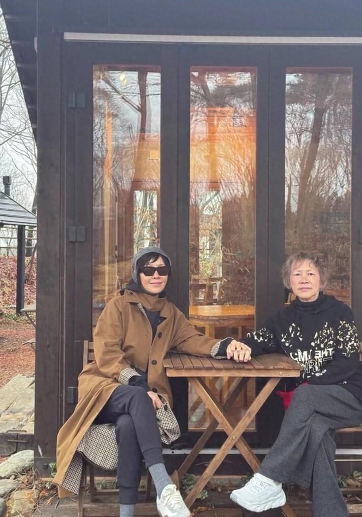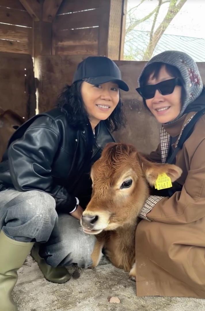 除了拥抱小牛,还有一张,是她和母亲坐在木屋前的方桌旁。 母女俩同款坐姿,她紧握妈妈的手,眼神温柔。
